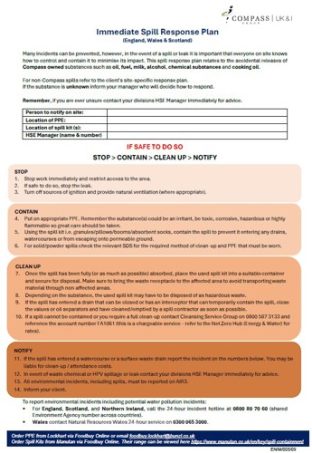 Spill kits can be ordered from: Compass Sites - Manutan & CH&CO - Safe & Sound