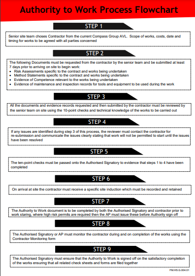 The Compass UK&I Authority to Work (ATW) process is a formal written procedure used to control works conducted by contractors and third parties that have been identified as requiring operational controls.
