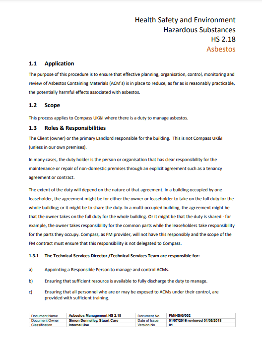To enable Compass Group UK & Ireland to identify and manage the risks associated with asbestos in the workplace.